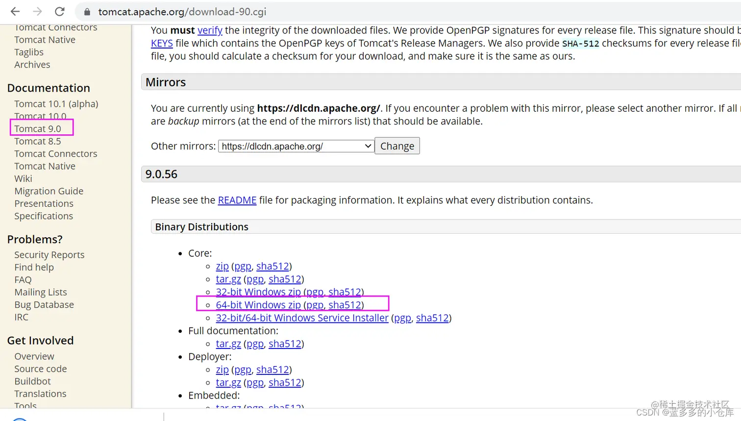 1、下载Tomcat1>官网:Apache Tomcat® - Apache Tomcat 9 Software Downloads这里我选择的是Tomcat9.0 64bit Windows(作为示例安装)(如图紫色框中所示)---自行下载安装