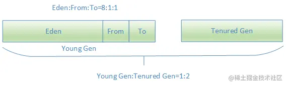 - 堆:Java虚拟机管理的最大的一块内存区域,Java堆是线程共享的,用于存放对象实例。也就是说对象的出生和回收都是在这个区域进行的。堆分为初生代(Young Gen)和老年代(Tenured Gen),比例默认为1:2,而初生代又分为Eden和From和To三个区域,比例默认为8:1:1,如下图