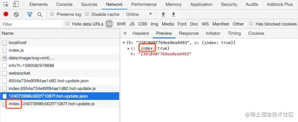 - 当 socket server 监听到对应的模块发生变化时,会生成两个文件.json(manifest文件)和.js文件(update chunk)