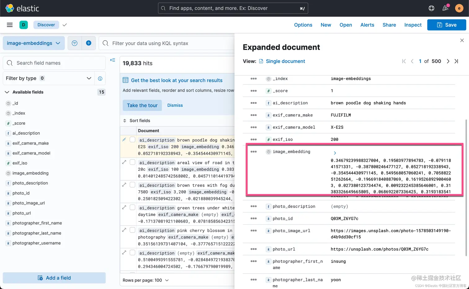 从上面,我们可以看出来 image_embedding 字段是一个 512 维度的 dense_vector 字段。它可以进行向量搜索。