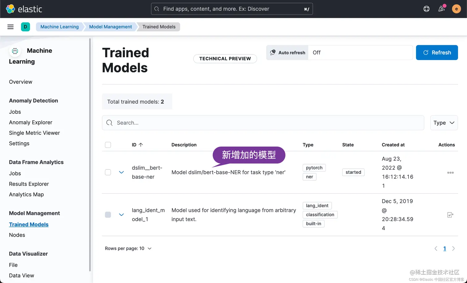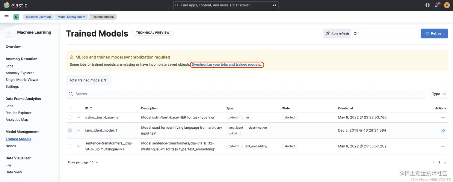 如果你在屏幕中看到缺少某些模型并看到一条消息。 需要 ML 作业和经过训练的模型同步,继续并单击链接以同步模型。