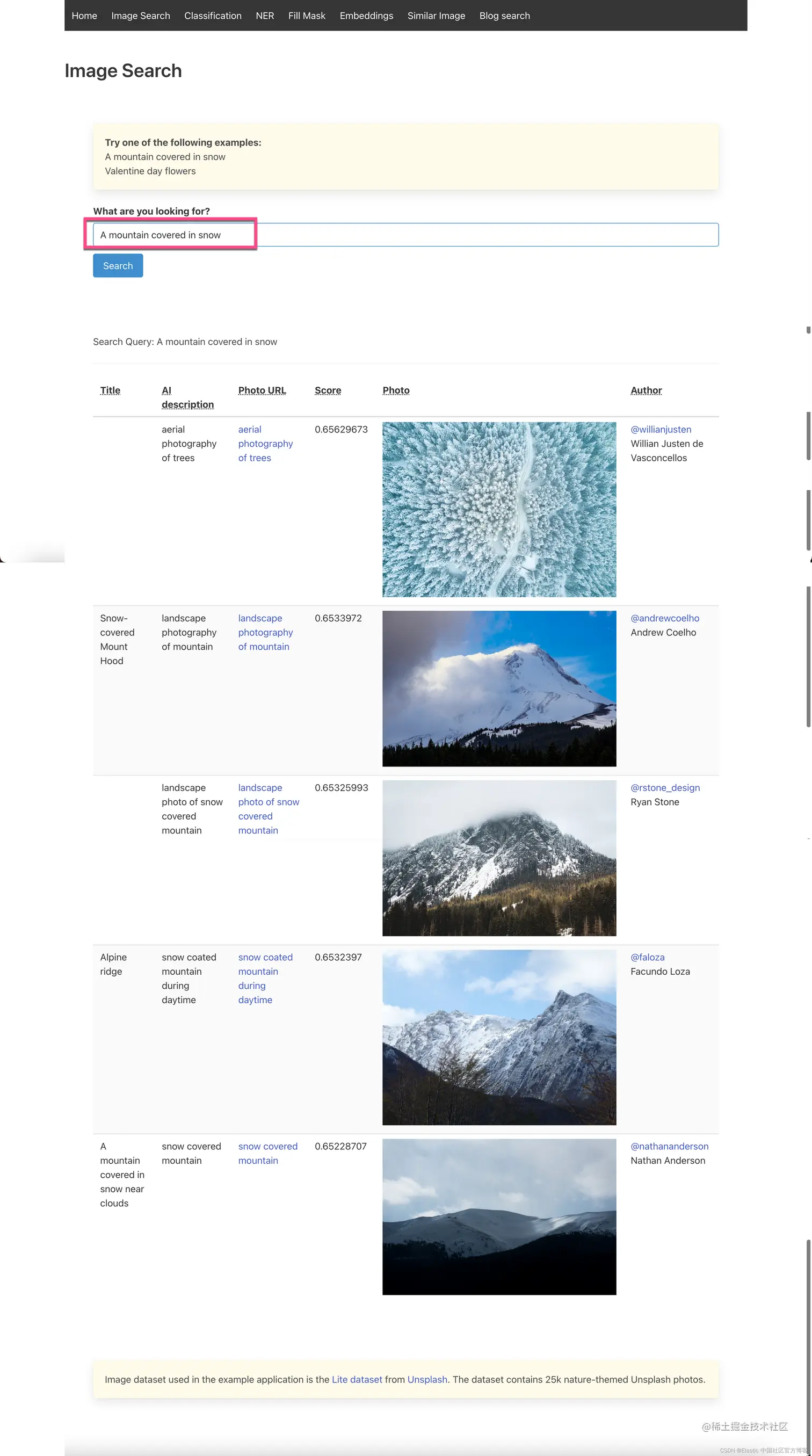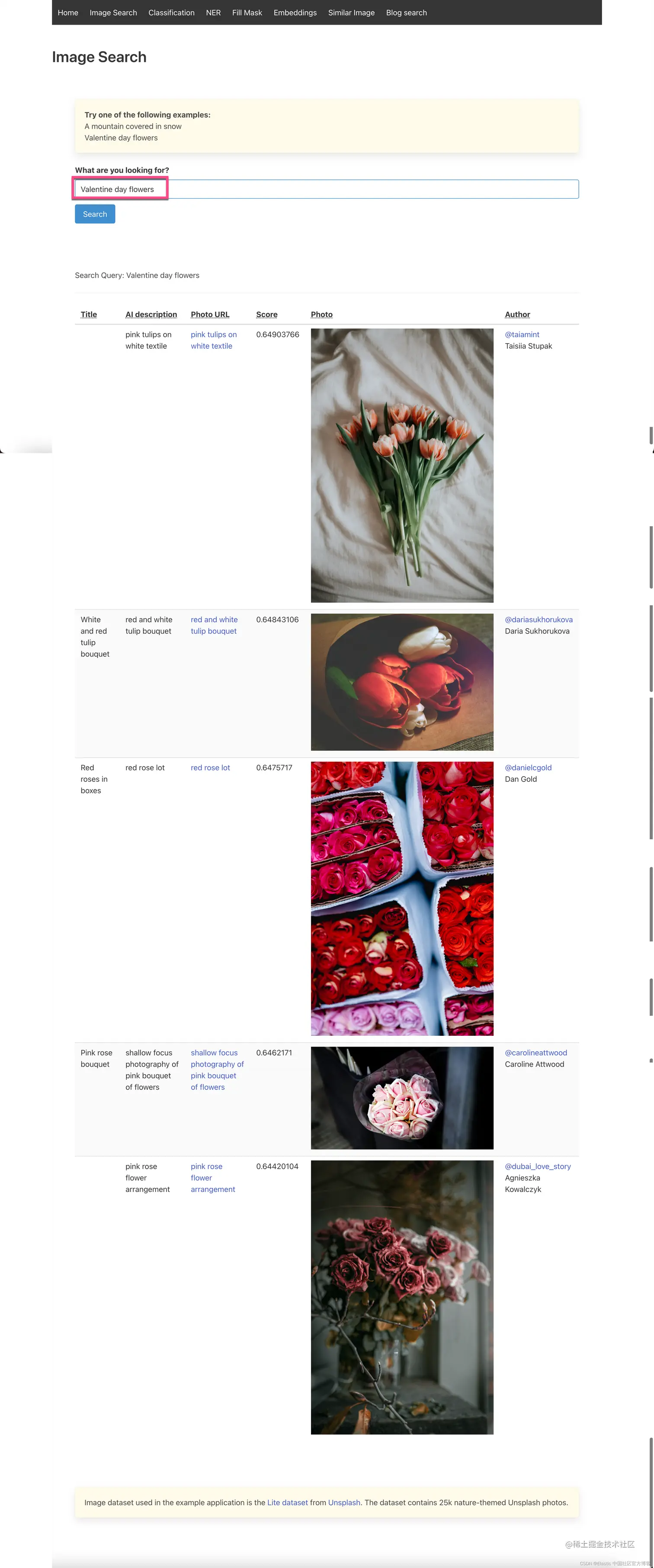 当我们输入 “A mountain covered in snow” 时,我们可以看到上面显示的画面。我们也可以使用上面的另外一个例子 “Valentine day flowers”,我们可以看到如下的搜索结果: