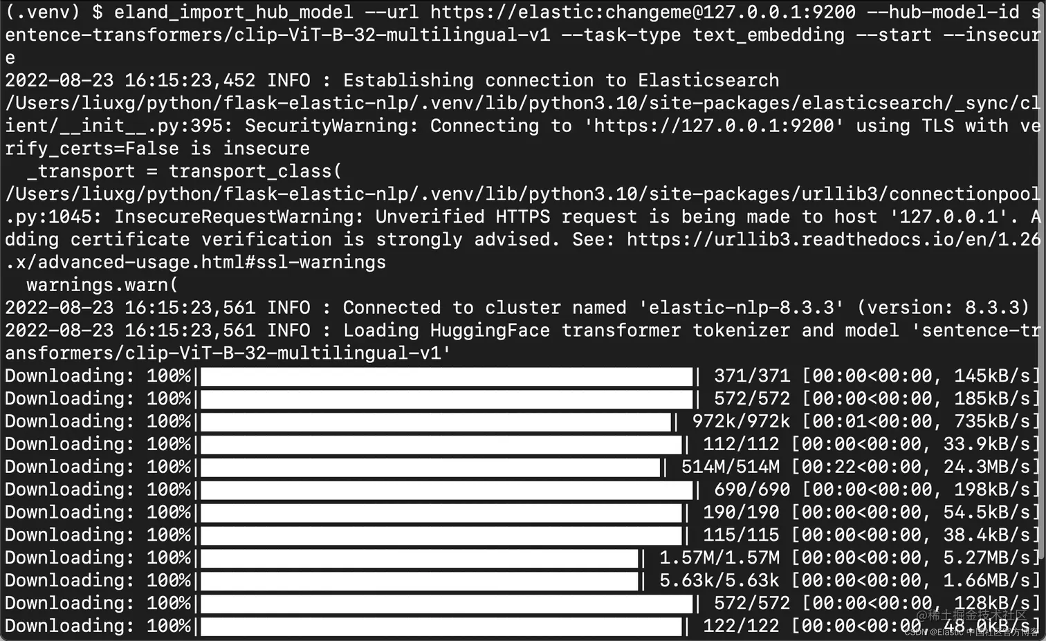 3. $ eland_import_hub_model --url https://elastic:changeme@127.0.0.1:9200 --hub-model-id sentence-transformers/clip-ViT-B-32-multilingual-v1 --task-type text_embedding --start --insecure