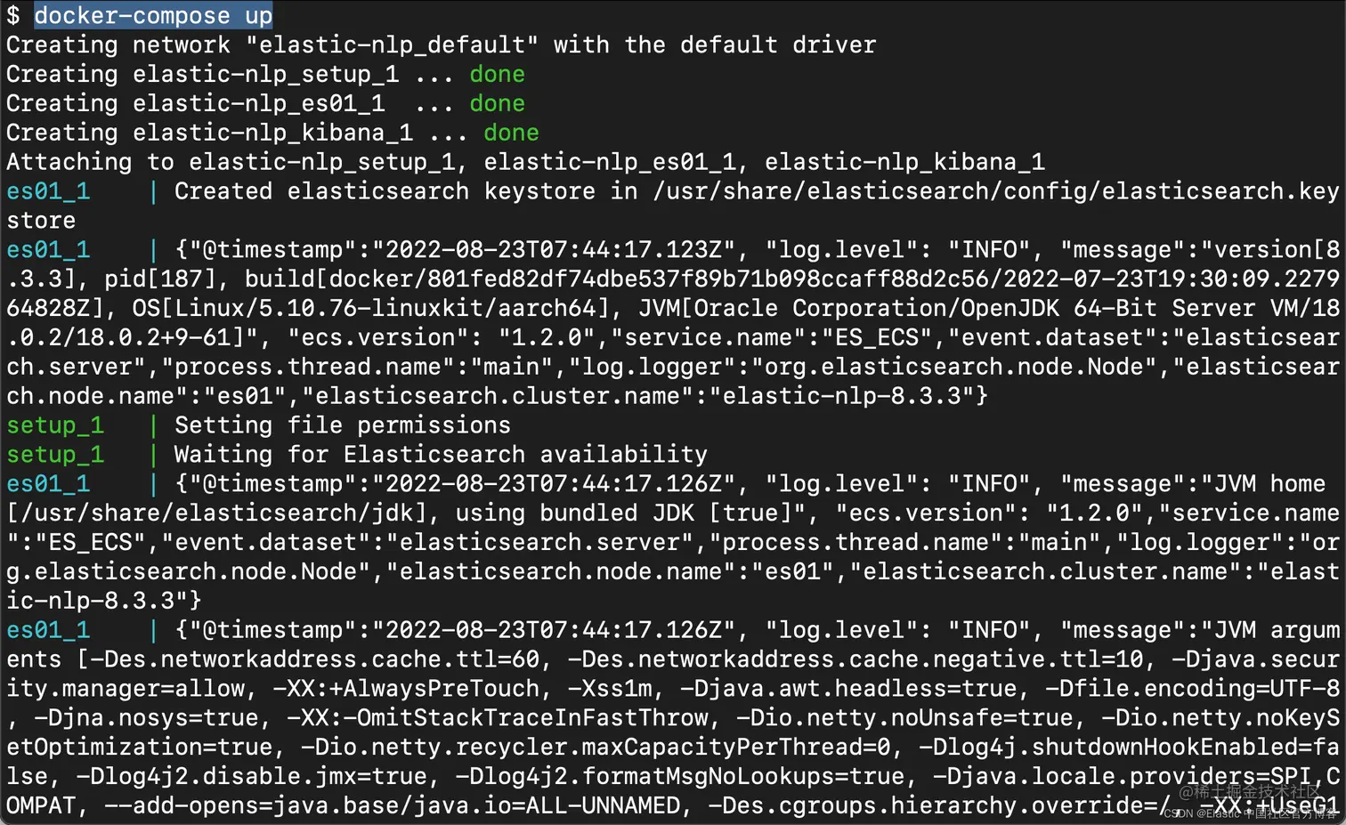 在运行上面的命令之前,我们可以查看当前目录下的 .env 文件的配置。针对我的情况,我修改了最新的 Elastic Stack 版本为8.3.3。执行上面的命令后,它会自动下载 Elasticsearch 及 Kibana 的镜像,并启动 docker;