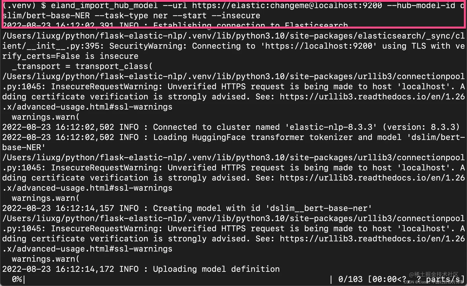 2. $ eland_import_hub_model --url https://elastic:changeme@localhost:9200 --hub-model-id dslim/bert-base-NER --task-type ner --start --insecure