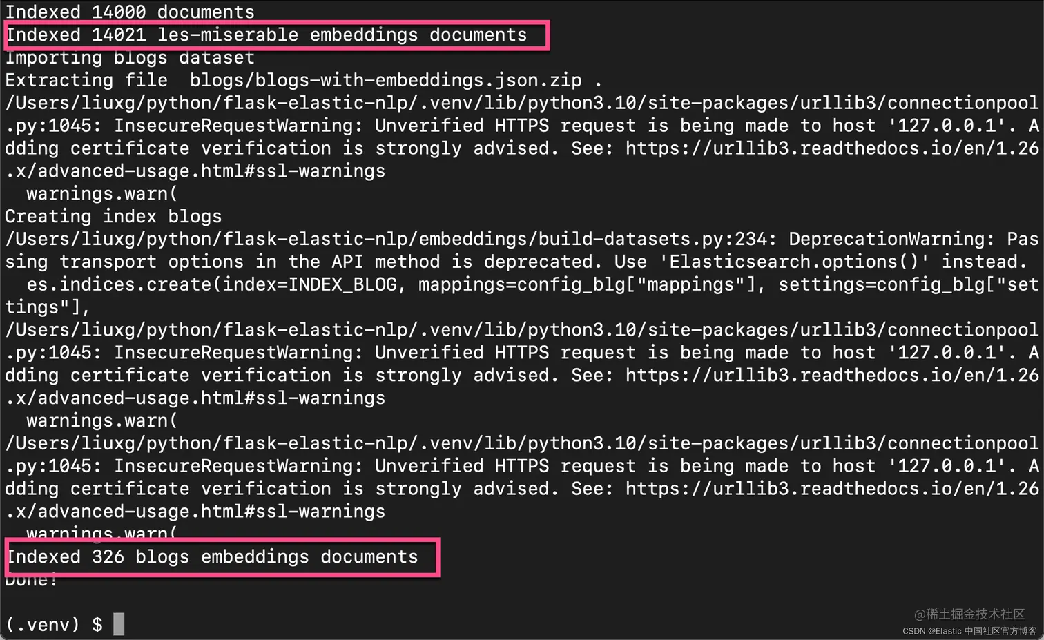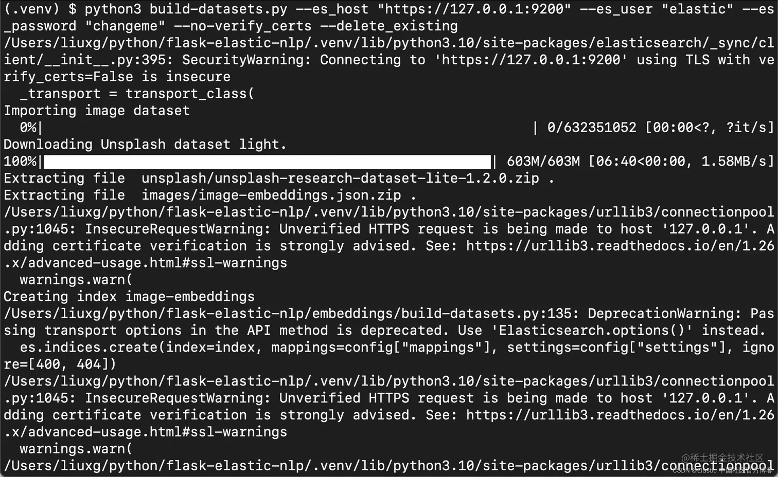 2. $ python3 build-datasets.py --es_host "https://127.0.0.1:9200" --es_user "elastic" --es_password "changeme" --no-verify_certs --delete_existing