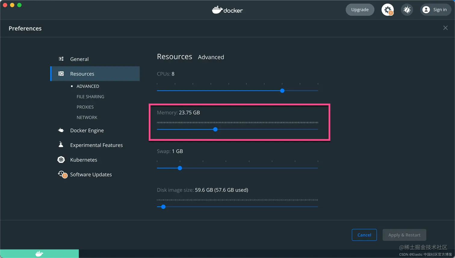 如果你的计算机没有足够的内存,那么你可以配置更少的内存,并且始终只同时运行 1 或 2 个模型,具体取决于您有多少可用内存。 要更改 docker-compose 的值,请转到 es-docker/.env 文件并更改 MEM_LIMIT。这个非常重要。如果你的电脑没有足够的内存,而你配置 21G,极有可能你的 docker 运行不起来。我们需要调整 .env 文件里的内存大小。你如果是在 macOS 上,你可以调整如下的内存配置: