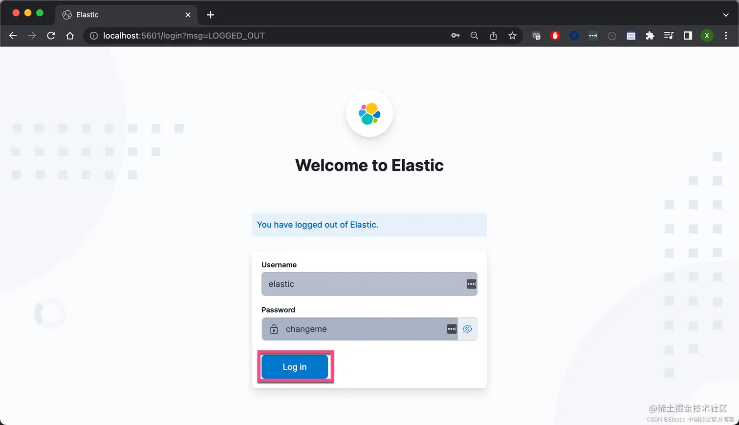 如果你看到上面的输出,则标明你的 Elasticsearch 的安装是成功的。我们也可以打开地址 http://localhost:5601 来登录 Kibana: