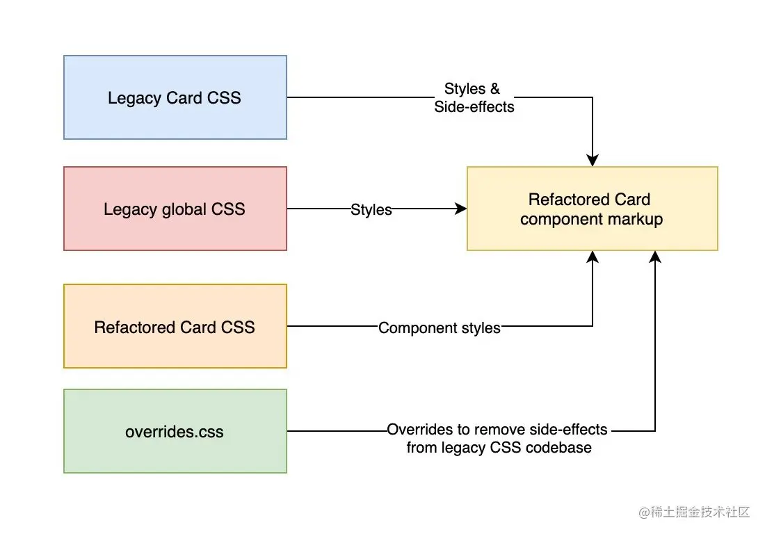 遗留的组件CSS和全局样式可能会引起意想不到的副作用,并将不需要的样式泄漏到重构的组件中。重构后的代码库可能会缺少有问题的CSS,而这些CSS是消除这些副作用所必需的。由于这些样式的影响范围更广,可能会影响其他组件,我们不能简单地直接编辑有问题的代码。我们需要使用一种不同的方法来解决这些冲突。