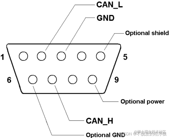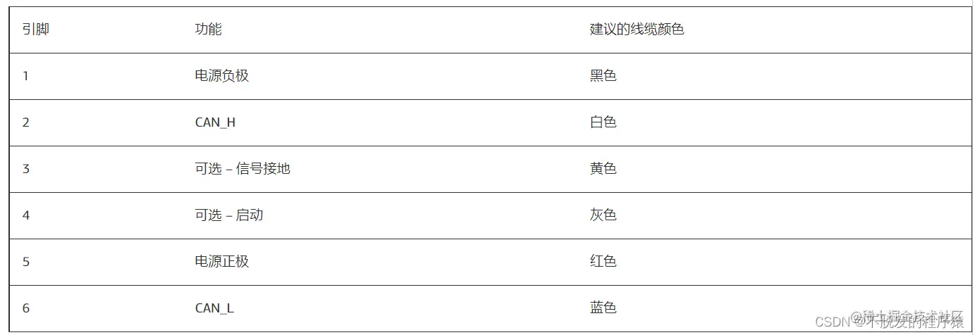 详解CAN总线:常用CAN连接器的使用方法 CSDN不脱发的程序猿 2022-08-23 481 阅读1分钟 本文将分享几种常用的CAN连接器的连线和使用方法。 1、9针DSUB CiA推荐使用9针DSUB作为工业标准连接器,实物如下图所示: 引脚定义和说明如下所示: 2、5针迷你C型接头 DeviceNet协议和SDS协议都兼容5针迷你C型接头,实物如下图所示: 引脚定义和说明如下所示: 3、6针德驰DT04-6P 德驰DT04-6P连接器安全、可靠、密闭性强,可以应用在汽车移动液压场合中,实物如下图所示: 引脚定义和说明如下所示: