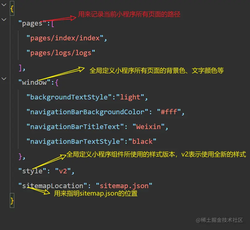 它是当前小程序的全局配置,包括了小程序的所有页面路径、窗口外观、界面表现、底部tab等。