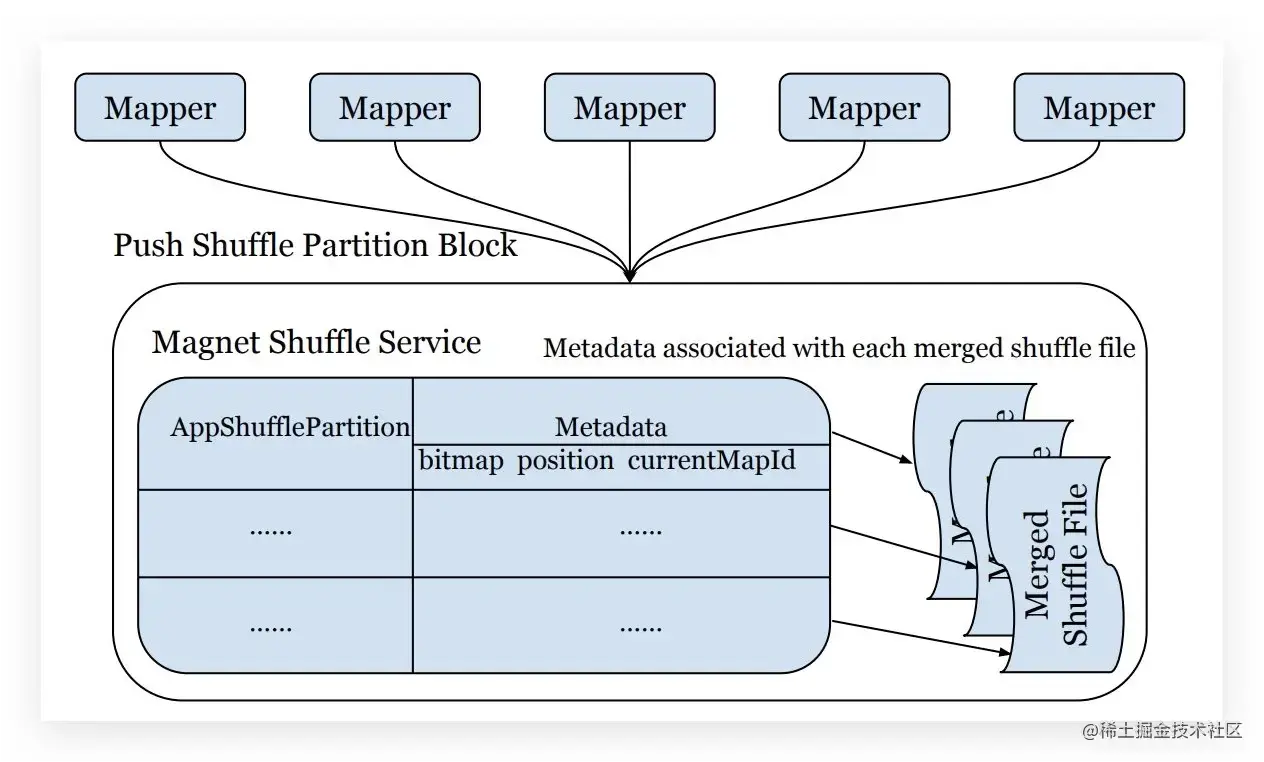 magnet shuffle service是一个强化版的ESS。将隶属于同一个shuffle partition的block,会在远程传输到magnet后被merge到一个文件中