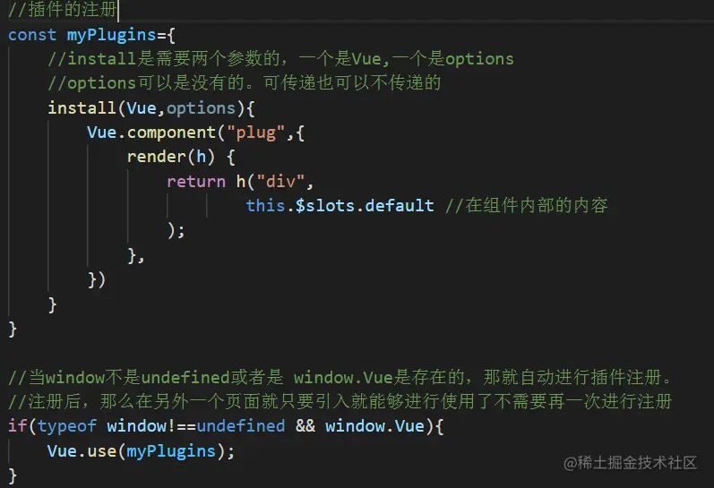 如果要定义一个插件,就是定义一个对象,然后在对象里边实现install的方法。
