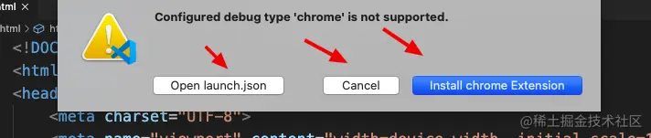 如果没有安装debugger chrome 则会跳出如下的提示,是否需要安装调试的工具。其中就有chrome的提示。