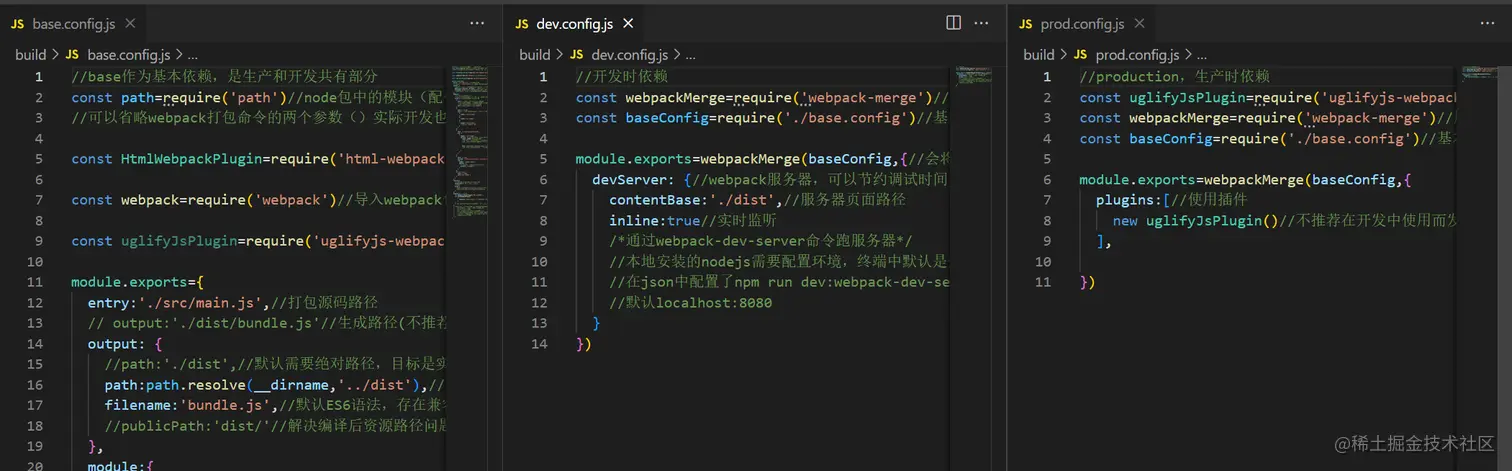 考虑到生产和开发两种情景,webpack的配置是有变化的,如:在生产环境中,代码都是丑化压缩的,而在开发中则会使用开发服务器,利于开发调试并监听代码改动实时更新。除去这两者依赖,就是基础依赖了,基础依赖是两者公用的依赖,可以说是交集,我们通常抽离出来单独管理。