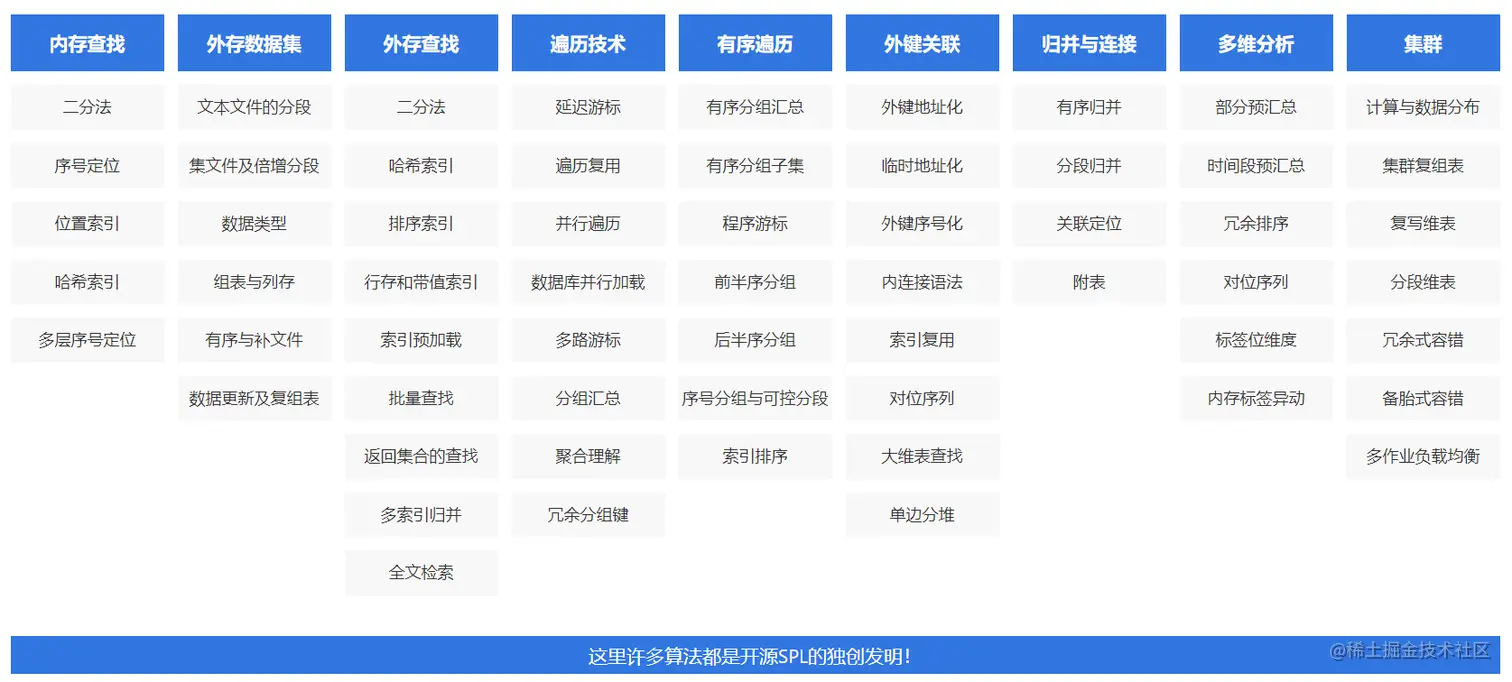 因为实际中很少使用,有不少应用程序员工作几年后都把大学时代学过的数据结构和算法课程内容忘了,而不理解这些基础算法知识时也就没办法设计出高性能算法方案。为此,SPL设置了专门的高性能专题,不仅涵盖高性能算法与优化技巧,还有性能优化课程与性能图书来授人以渔。