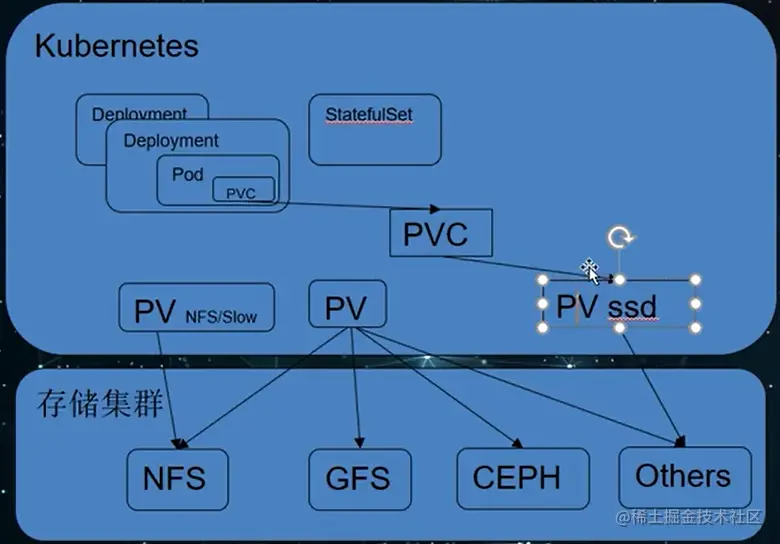 - persistentVolumeReclaimPolicy:Recycle,回收,rm -rf。Deployment -> PVC -> PV,Recycle。Retain,保留。Delete,PVC -> PV,删除PVC后,PV也会被删掉,这一类的PV,需要支持删除的功能,动态存储默认方式。