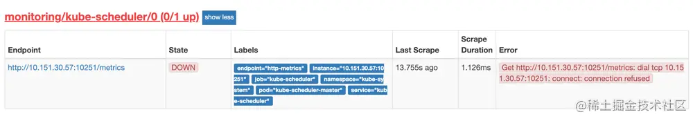 我们可以看到大部分的配置都是正常的,只有两三个没有管理到对应的监控目标,比如 kube-controller-manager 和 kube-scheduler 这两个系统组件,这就和 ServiceMonitor 的定义有关系了,我们先来查看下 kube-scheduler 组件对应的 ServiceMonitor 资源的定义:(prometheus-serviceMonitorKubeScheduler.yaml)