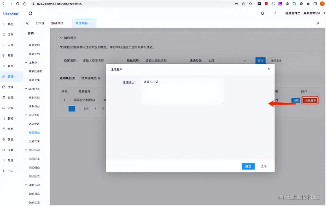 点击审核按钮,可以审核专区商品。如果选择审核拒绝,商家可以重新提交审核。