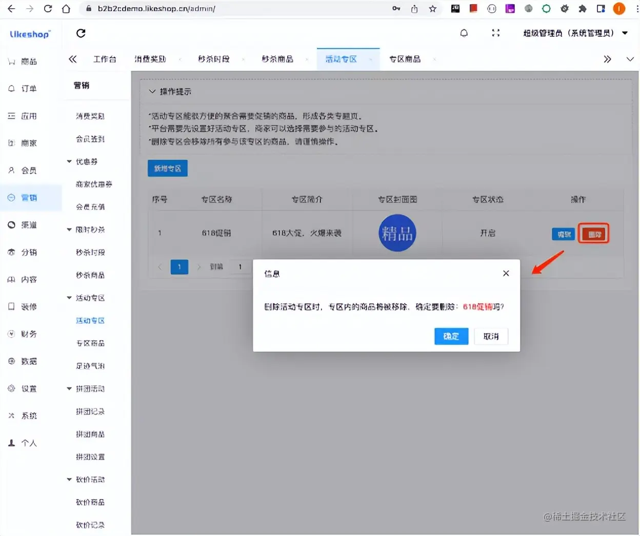 点击删除活动专区,可以删除对应的活动专区。注意,删除专区后,该活动专区的商品将会全部移除,需要谨慎操作。