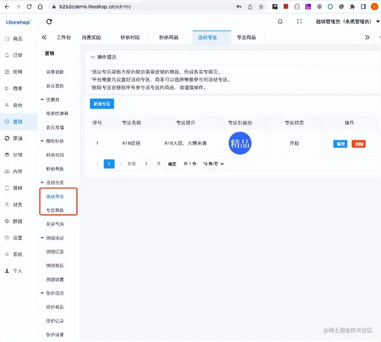 活动专区营销功能相对简单,主要走通平台创建专区,商家提交商品审核,平台审核商品流程,实现业务闭环。
