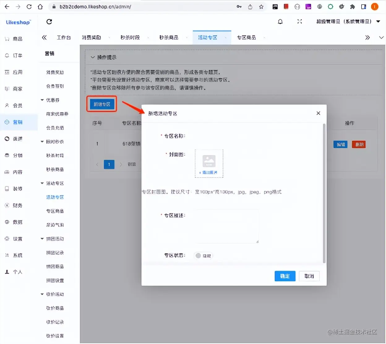 点击新增活动专区,填写专区名称,封面图,专区描述即可创建一个活动专区。
