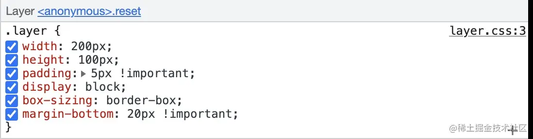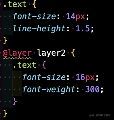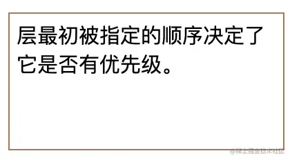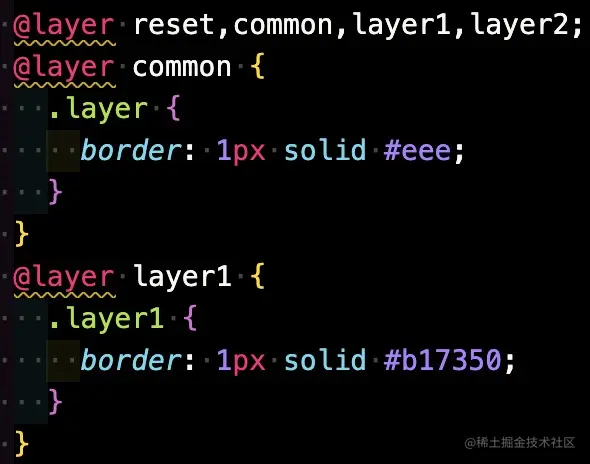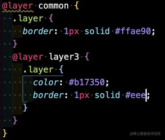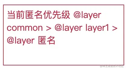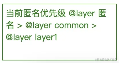 | 嵌套优先级 | 嵌套优先级 @layer common 大于 @layer layer3。把@layer common这个遮住,其实就是非@layer与@layer的优先级,这样是不是好理解了。 | |