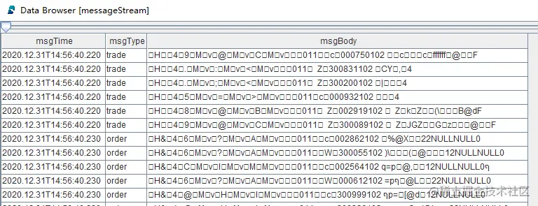 异构回放时 outputTables 参数指定的表至少需要包含以上三列。回放完成后,表 messageStream 的数据预览如下: