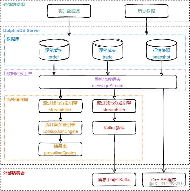 - 在 DolphinDB 的订阅中,通过 Kafka 插件将回放结果实时写入外部的消息中间件 Kafka;