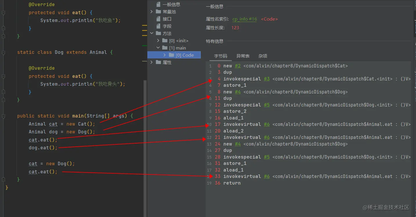 这个结果相信和大家想的是一致的,那大家有想过JVM是怎么找到具体的类型执行的呢?我们定义的引用类型就是Animal,JVM是根据什么来找到对应的Cat 或者Dog这些具体的实例执行对应的方法呢?