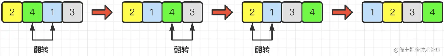 想到这里,其实就会有种变化样式很多,变种很复杂的感觉了。但是,题目中还有一句关键描述,就是“你可以选择任意非空子串翻转”并且“可以执行任意次”。那么其实这种对于翻转操作的限制一下子就放宽太多了。那由于子数组只有一个元素翻转操作没有任何改变。那么,我们就以最少的子串,即:两个元素的子串,来看一看翻转的过程。下图的示例就是题目描述中示例1的内容,即:试图将arr=[2,4,1,3]翻转为target=[1,2,3,4]。具体操作如下图所示: