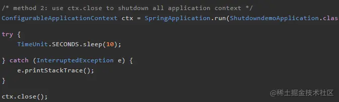 第二种方法也比较简单,获取程序启动时候的context,然后关闭主程序启动时的context。这样程序在关闭的时候也会调用PreDestroy注解。如下方法在程序启动十秒后进行关闭。