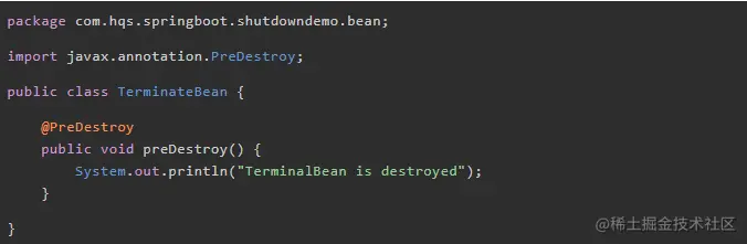 接下来,咱们创建一个SpringBoot工程,然后设置一个bean对象,配置上PreDestroy方法。这样在停止的时候会打印语句。bean的整个生命周期分为创建、初始化、销毁,当最后关闭的时候会执行销毁操作。在销毁的方法中执行一条输出日志。