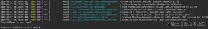 第四种方法,通过调用一个SpringApplication.exit()方法也可以退出程序,同时将生成一个退出码,这个退出码可以传递给所有的context。这个就是一个JVM的钩子,通过调用这个方法的话会把所有PreDestroy的方法执行并停止,并且传递给具体的退出码给所有Context。通过调用System.exit(exitCode)可以将这个错误码也传给JVM。程序执行完后最后会输出:Process finished with exit code 0,给JVM一个SIGNAL。
