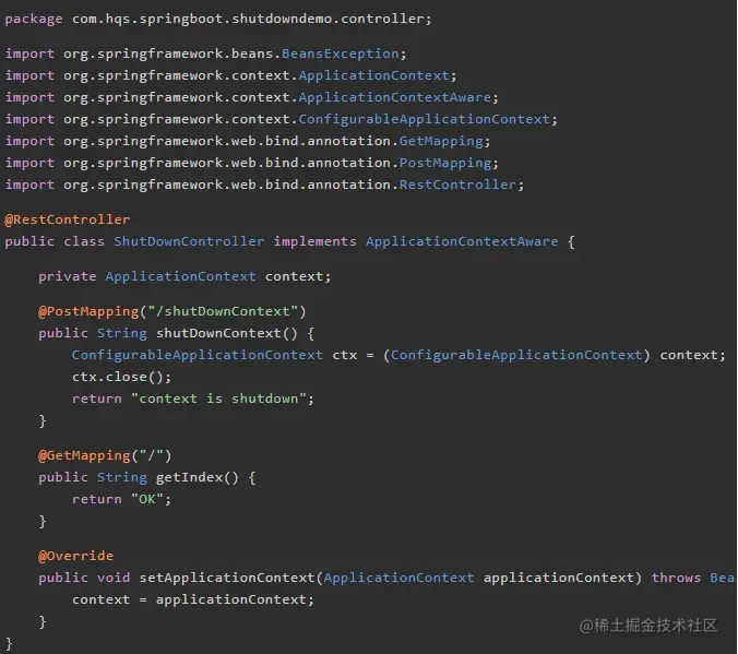 第五种方法,自己写一个Controller,然后将自己写好的Controller获取到程序的context,然后调用自己配置的Controller方法退出程序。通过调用自己写的/shutDownContext方法关闭程序:curl -X POST