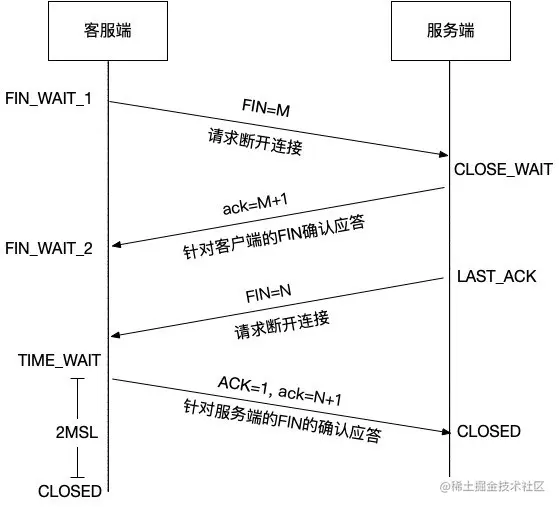 客户端收到 FIN=N 报文后,就知道可以关闭连接了,但是他还是不相信网络,怕服务器不知道要关闭了,所以发送 ACK=1,ack=N+1 后进入 TIME_WAIT 状态,如果服务端没有收到 ACK 则可以重传。服务端收到 ACK 后,就知道可以断开连接了。客户端等待了 2MSL(Maximum Segment Lifetime,报文最大生存时间,一般为 30s)后依然没有收到回复,则证明服务端已经正常关闭,那好,我客户端也可以关闭了。最终完成了四次挥手。