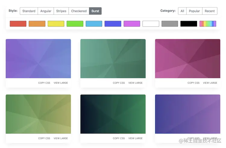 另一个方便的工具是Gradient Magic,它消除了麻烦,使使用梯度成为一个简单的复制和粘贴行为,这是一个独特的CSS梯度库,包括从标准梯度到角度、条纹、格子和爆裂梯度等各种梯度。为了找到你的最爱,你可以按风格和颜色来浏览这个库。对任何工具箱来说都是一个很好的补充