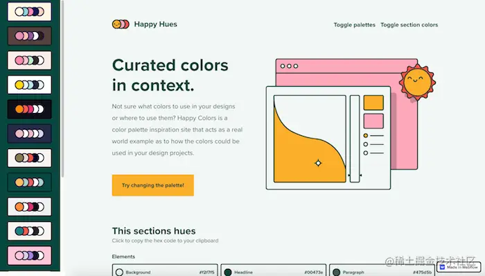 Happy Hues为你提供调色板的灵感,同时作为一个现实世界的例子,说明如何在你的设计中使用这些颜色。只要改变调色板,Happy Hues网站就会改变其颜色,向你展示你喜欢的调色板在实际设计中的样子。聪明!