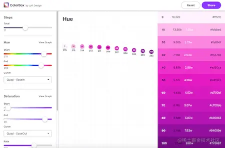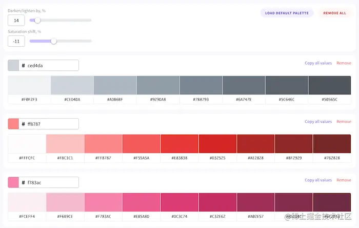 要定制阴影系列,只需调整你想使原色变亮/变暗的百分比,并改变饱和度的变化。一旦你对结果感到满意,你可以一键复制一个颜色的十六进制值或整个调色板。