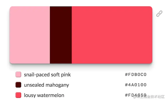 作为一种发现有趣的色彩组合的有趣方式,这些调色板是从Twitter机器人@colorschemez上手工挑选出来的。该程序随机生成颜色组合,并将每种颜色与超过2万个单词列表中的一个形容词相匹配。隐藏在这些不寻常的名字背后的当然是你可以立即使用的真实的十六进制颜色值--例如,在蜗牛节奏的软粉色和它的伙计们的情况下,#FDB0C0,#4A0100, 和#FD4659 。对颜色的一种有趣的看法。