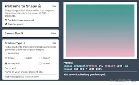 Shapy。隐藏在可爱的名字背后的是一个强大的工具:一个由Victoria Bergquist创造的渐变形状编辑器。Shapy让你发现和探索CSS梯度的力量,通过在单个div 标签上分层和移动梯度来创建形状和图像。只需使用滑块来定制画布大小、渐变类型、色块和盒子的细节,一旦你对预览中的内容感到满意,你就可以通过点击来复制CSS。很方便!