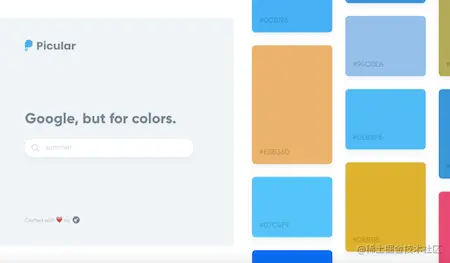 你输入一个搜索词,就会看到一个链接列表。这就是搜索引擎通常的工作方式,对吗?Picular则不同。Picular不是搜索相关的网站,而是向您展示符合您搜索的颜色。例如,"夏天 "将返回不同色调的蓝色,以及一些沙黄色和棕色,还有少量的粉红色。每种颜色都标有它的十六进制值,所以如果你想在一个项目中使用它,只要点击它,它就会被复制到你的剪贴板上。