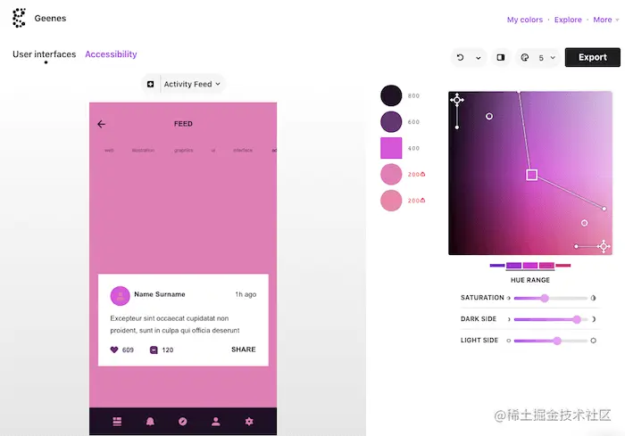 这个工具可以让你调整色调范围和饱和度,并将调色板应用于三个可选择的UI模型中的一个。一旦应用,你可以触发不同类型的视力障碍,看看受影响的人是如何看待颜色的,最后,对你的调色板的最佳色调作出明智的决定。要立即使用这些颜色,只需复制和粘贴它们的代码或将它们导出到Sketch。