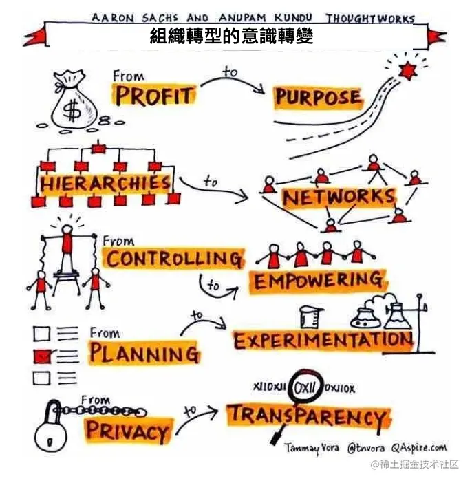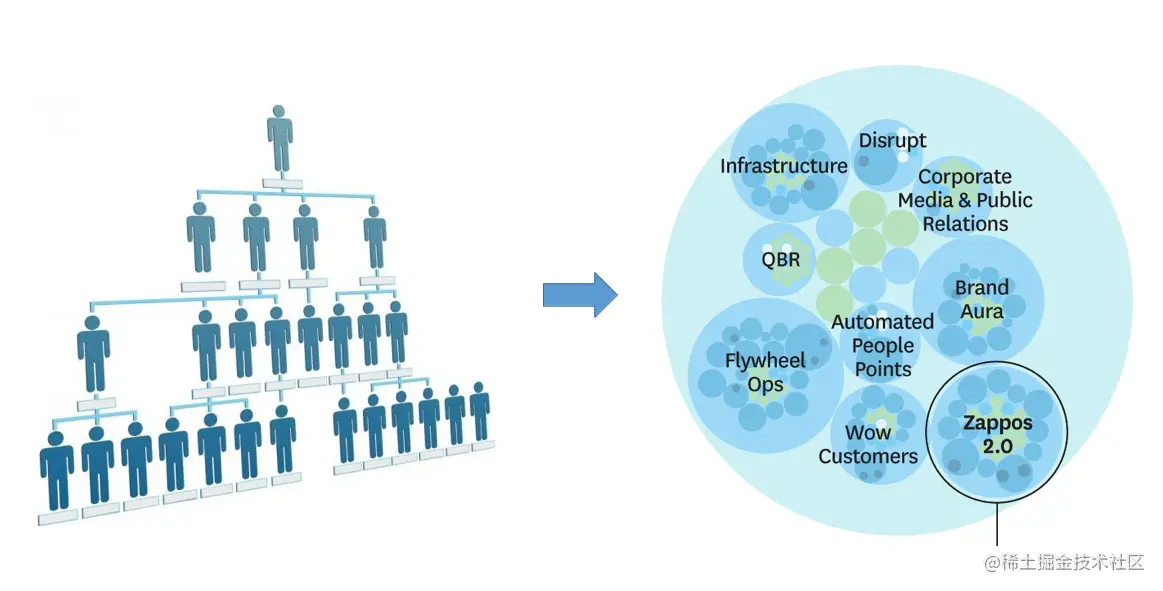 在美捷步的增长过程,图表左方的模式很自然就会涌现出来,因为我们不知道还有什麽其他方式,但自从看完《城市的胜利》、《重塑组织》之后,我们被右方的模式深深啓发,并决定进行组织改革,往右方的模式走去,以适应这个複杂的新世界,问题是,如何实现组织转型呢?美捷步透过导入合弄制来实现。