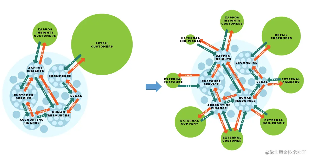 绿色箭头表示资金或资源,橙色箭头表示价值,用资金换价值。公司内部称之为「客户决定预算」,从自上而下的指挥控制,转为由圈子组成网络,把圈子看作是整个生态系统内一个个小型企业。每个小企业单位有自己的内部和外部客户。美捷步目前有两个外部收入来源,最大的是零售客户,另一个是咨询服务,叫做「美捷步洞见」。