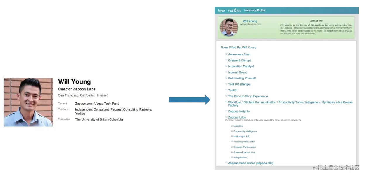 经历大约1年半到2年时间,美捷步从传统的科层制管理,变成完全的合弄制模式。合弄制带来最大、最有影响的变化之一是人们可以跨领域工作,承担多个使命,例如: