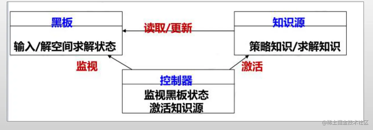 当黑板的状态满足了知识源的执行条件时,该知识源被控制器触发并进行计算,然后将结果更新到黑板上。这种更新又导致其他只是源参与计算并更新黑板,知道找到问题为止