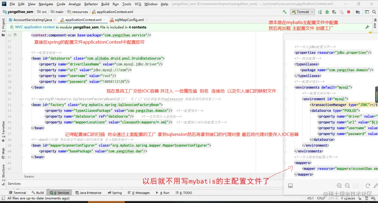 那么我们可以直接将sqlsession工厂添加到IOC容器中,同时给sqksession工厂注入相应的属性值代替原Mybatis主配置文件(看图左和图右),并且扫描Mybatis接口对象的映射配置文件,底层会通过工厂获取 接口的代理对象 并且存入IOC容器