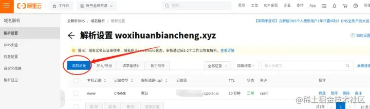 进入云解析DNS页面后,我们点击蓝色的“添加记录”,对我们申请的安全证书进行关联验证