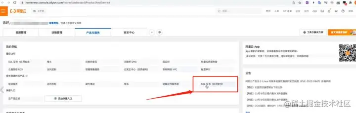 要申请https协议所需的安全文件,我们必须返回域名供应商处,申请与域名对应的SSL文件。首先我们回到阿里云平台,进入控制台页面,并从中找到SSL证书项。